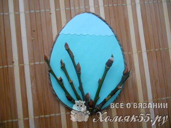 Берем веточки вербы. Нарезаем их на небольшие кусочки. Прикладываем к нижней части яичка, примеряем. После того, как вы определились с окончательной раскладкой веточек, берем клеящий пистолет и наносим небольшое количество клея на кончики веточек, по очереди приклеивая их к изделию.