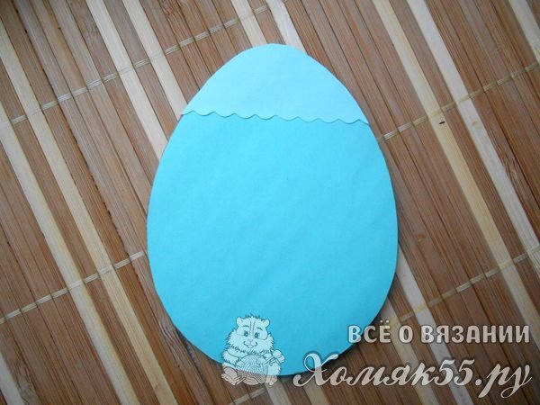 Прикладываем синюю заготовку к яичку сверху, примеряем. Следующим шагом наносим клей уже на саму бумагу и приклеиваем к яичку, хорошо проглаживаем. После этого переворачиваем изделие и отрезаем ненужную бумагу.