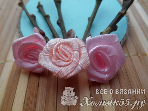 Маленькими розочками из атласной ленты прикрываем «место приклеивания» веточек. Приклеиваем цветы также с помощью клеящего пистолета.
