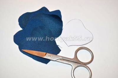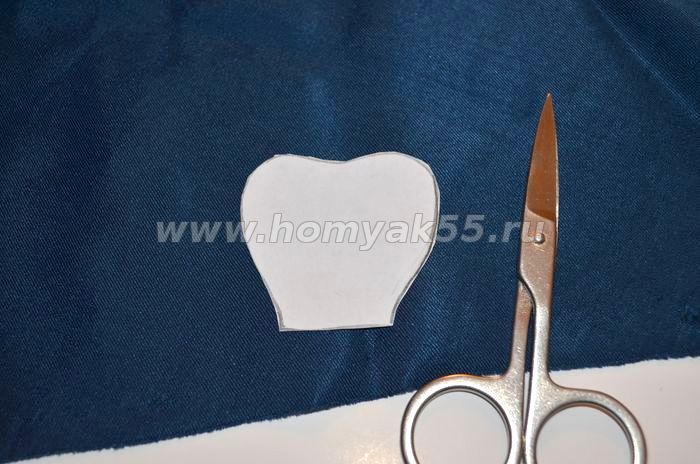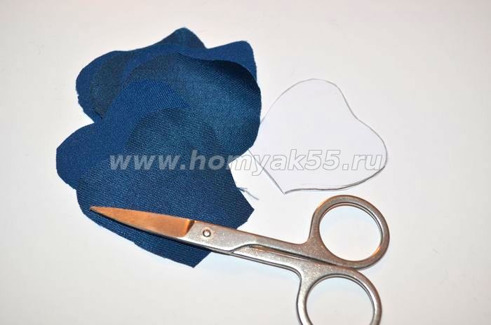 2. Далее будем прикладывать бумажный шаблон на атласную ткань с тыльной стороны, обводить его по контуру тонким кусочком мела и выкраивать нужные детали. Для одной розочки нам потребуется 7-10 лепестков.