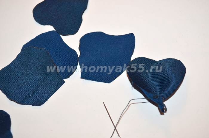3. Чтобы ткань не сыпалась, и наши цветочки выглядели опрятно, каждый лепесток аккуратно оплавляем по краю над пламенем свечи или при помощи обычной зажигалки. Кроме всего прочего эта процедура слегка деформирует ткань и лепесток по форме станет еще больше походить на настоящий. Затем берем первый лепесток и присобираем его в нижней части при помощи иголки с ниткой.