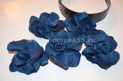 7. Изготавливаем еще 4 таких же розочки и густо приклеиваем их при помощи горячего клеевого пистолета на поверхность ободка друг за другом. Также цветы можно пришить при помощи иголки с ниткой, если у вас не оказалось под руками вышеупомянутого инструмента.