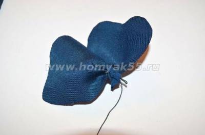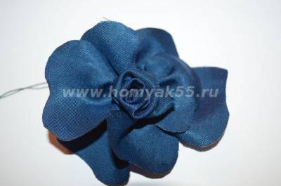 6.Затем берем прямоугольный отрезок ткани, складываем его вдоль пополам лицевой стороной вверх и скручиваем из него бутон розочки, который фиксируем при помощи иголки с ниткой и пришиваем его к основному цветку.