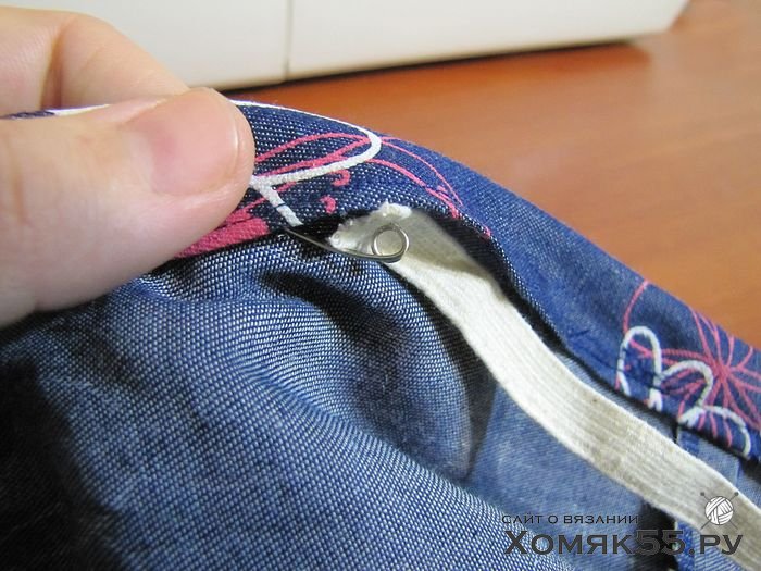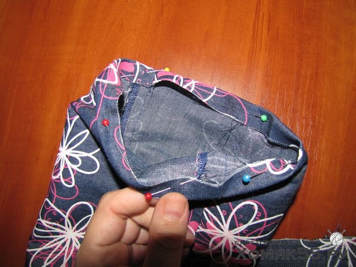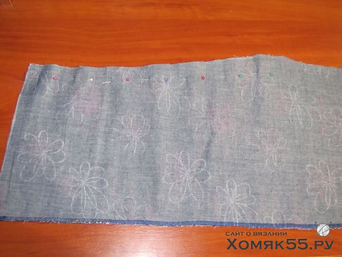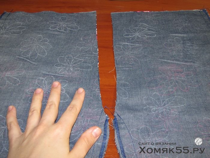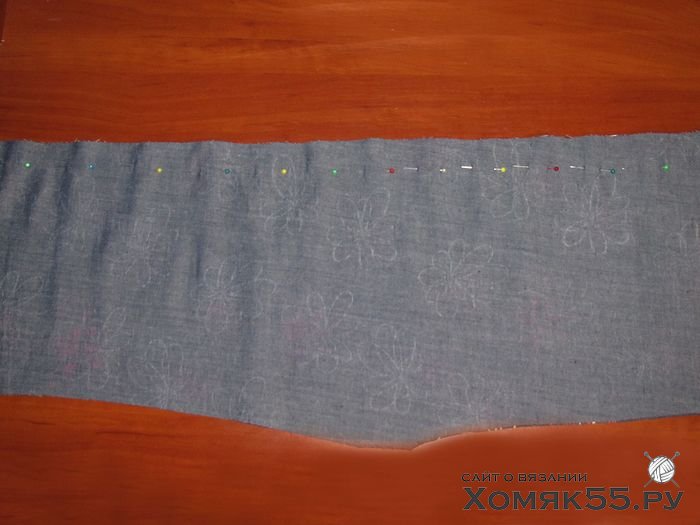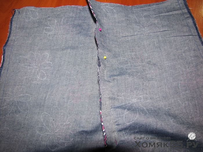 Сложим 2 детали джинс лицом внутрь. Боковой шов скрепим портновскими булавками.