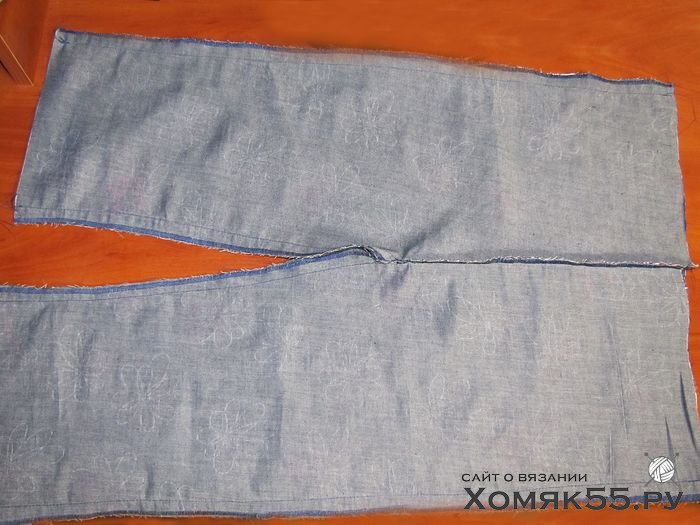 Затем положим сложенные пополам старые брючки, по контуру обведем их с помощью мыла оставляя на 1 сантиметру на припуски.
