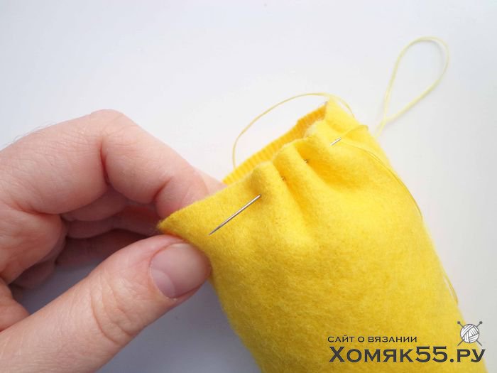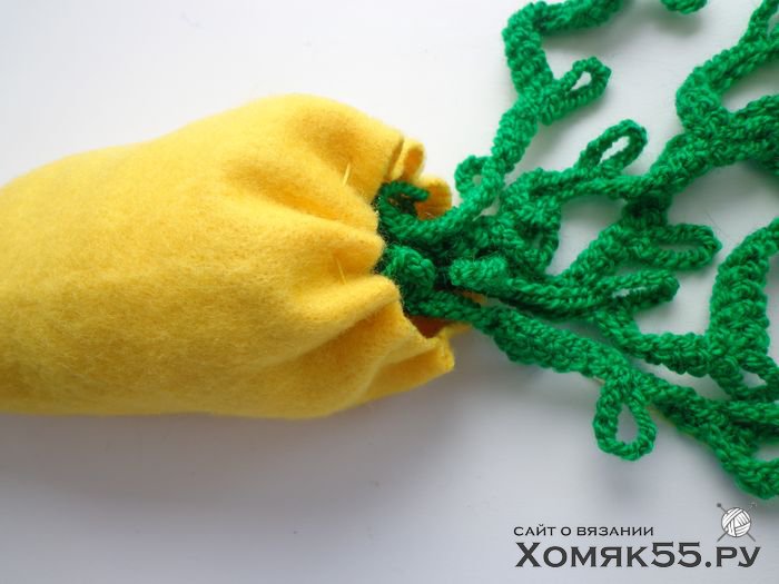 Слегка стягиваем нить, но оставляем небольшое отверстие, в которое вставляем связанные хвостики для морковки.
