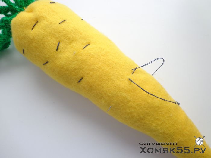 Берем уже заполненное основание морковки и прошиваем ее в верхней части по контуру крупными стежками.