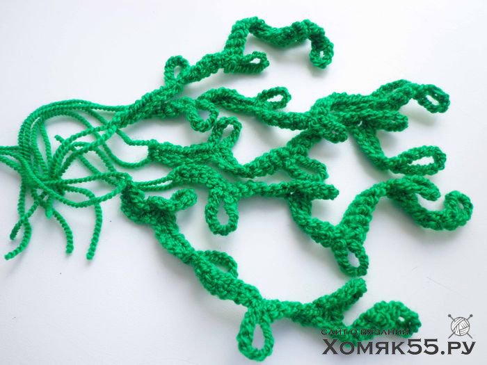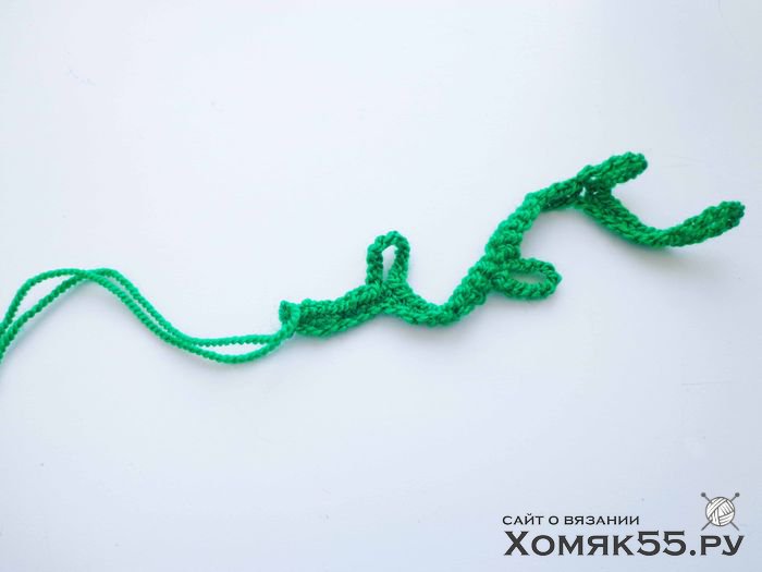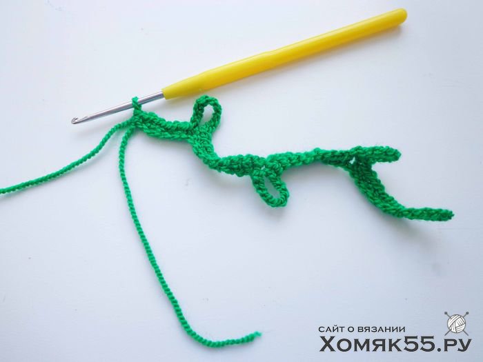Крючок с петлей заведите в 10-ю петлю, считая от крючка. Вытяните петлю. .Провяжите две петли вместе. Таким образом мы вывязываем листики.