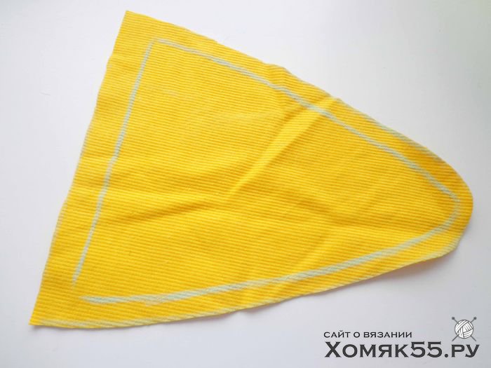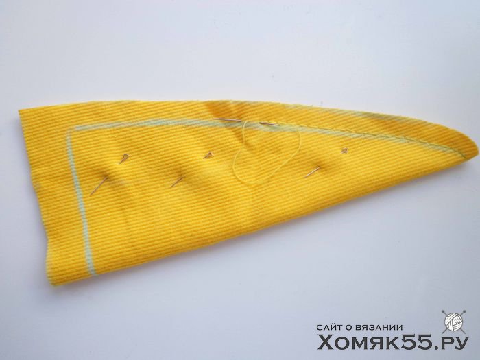 Вырезаем бумажную выкройку. Раскладываем ее на ткани по изнаночной стороне. Крепим к ткани выкройку булавочками.