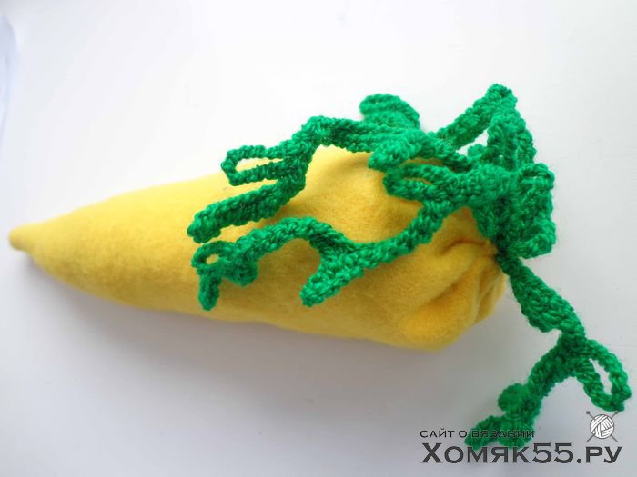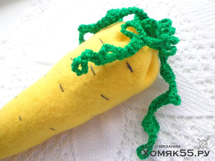 Хвостик для морковки можно изготовить из ткани, фетра или связать. Остановимся на последнем варианте. Для этого возьмите крючок, наберите 40 воздушных петель.