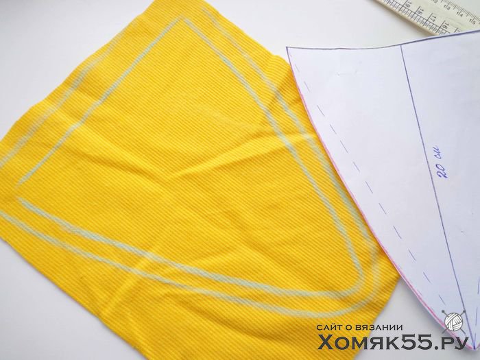 С помощью мела обводим деталь выкройки по контуру. Отступаем от основного контура по 1 см и рисуем еще один контур. Это будут припуски на швы.