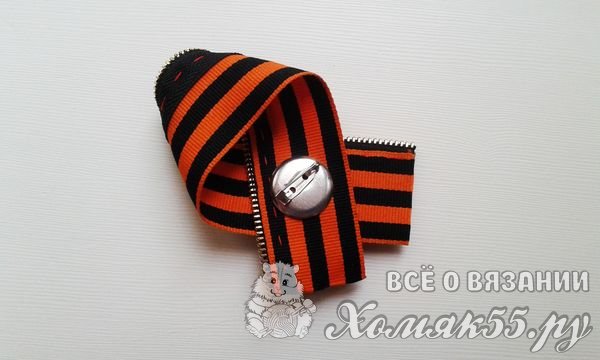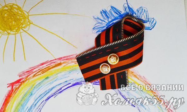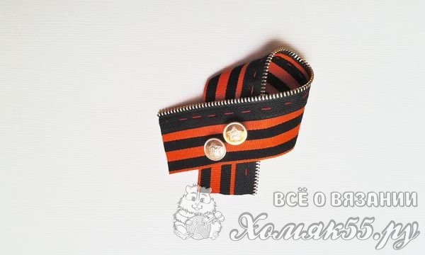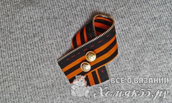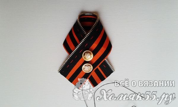 6. На месте перекреста ленты пришить две небольшие пуговицы с символикой.