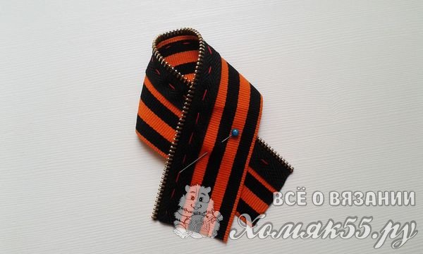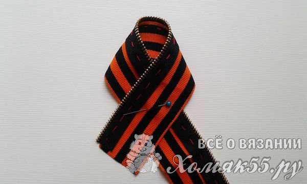 4. Из ленты с пришитой молнией сложить петельку с перекрестом сторон посередине. Заколоть булавкой.