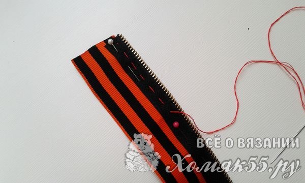 3. Нитью красного или оранжевого цвета проложить стежки по наметке, после чего убрать булавки.
