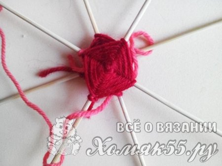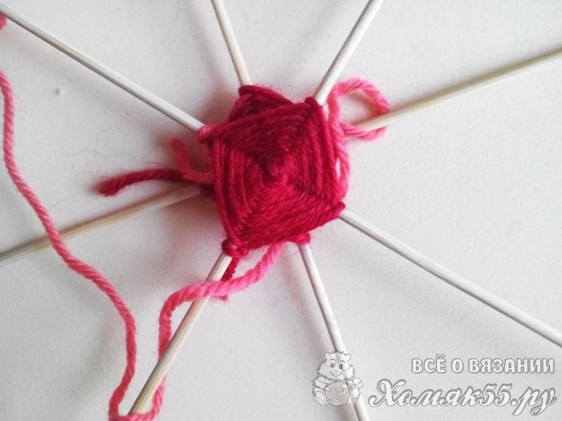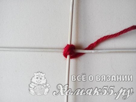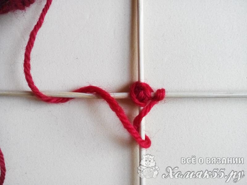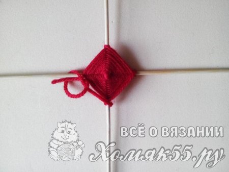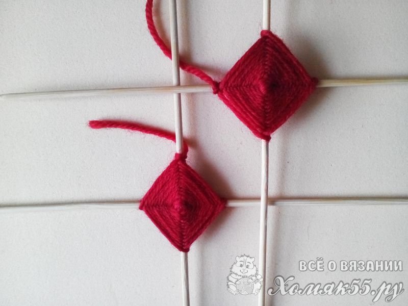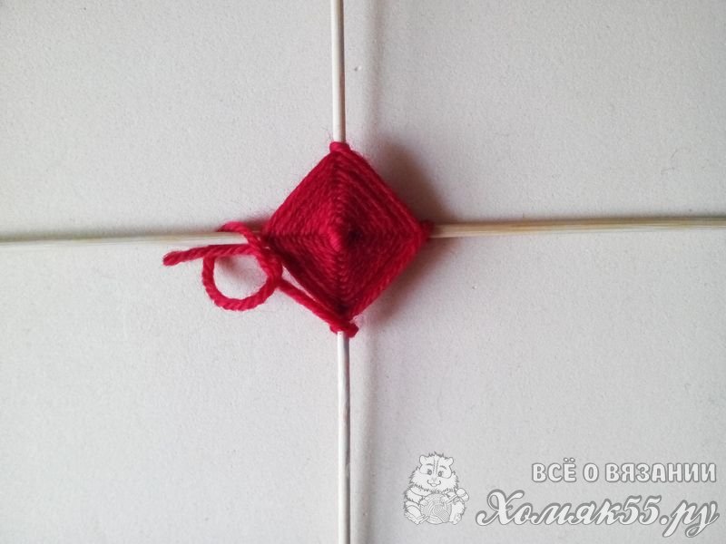Далее плетем квадрат. Для квадрата нам нужно завязать нить на одной из палочек нижнего креста и по низу обвязываем каждую вторую палочку..