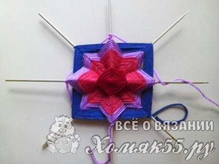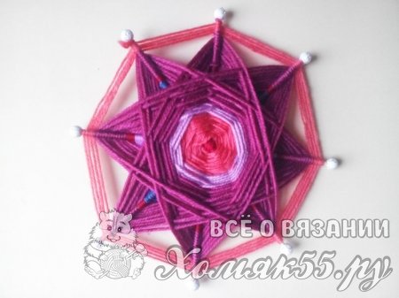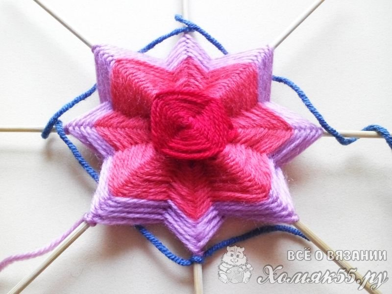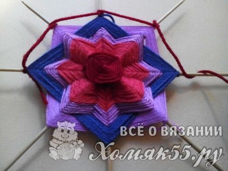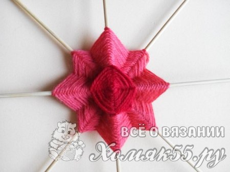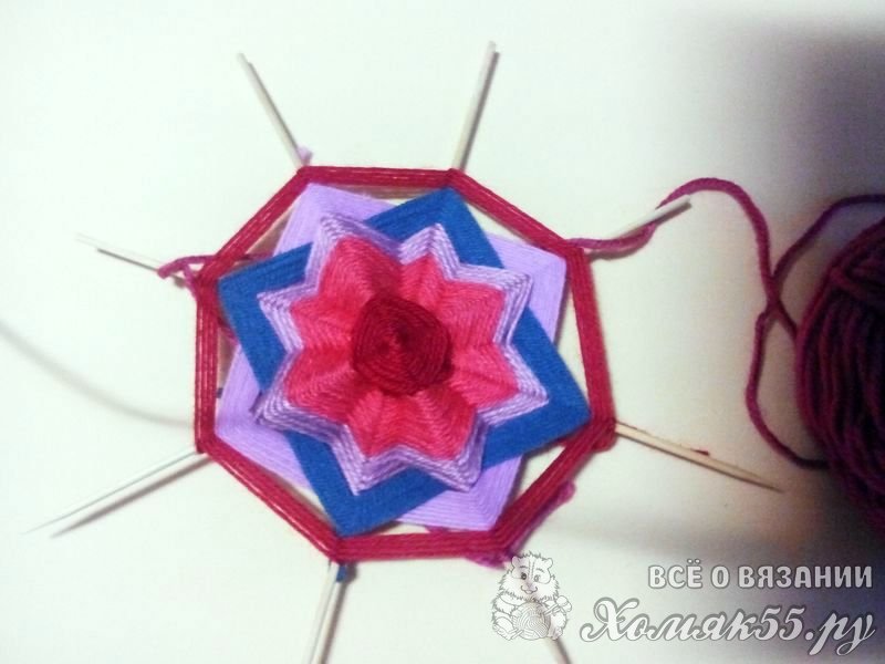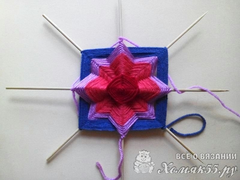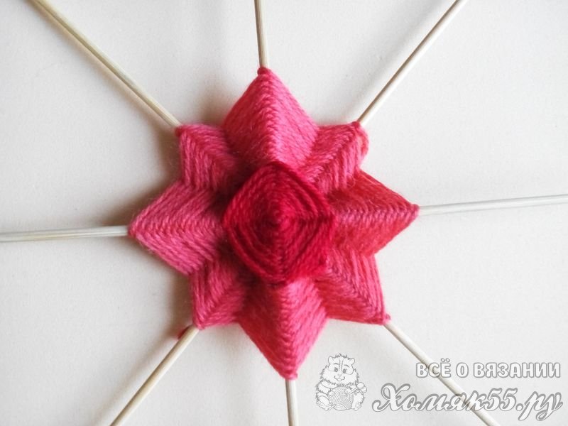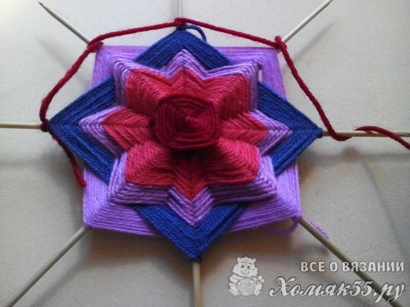 Теперь нам нужно скрепить два квадрата между собой. Завязываем нить другого цвета и начинаем обвязывать каждую третью палочку. Нужно следить, что бы квадраты не смещались и между лучами было ровное растояние. Сильно нить не натягиваем, работа может выгнутся. Можно поменять цвет и плести дальше. Так же нам нужно запомнить палочку с которой мы начали плетение, на ней и же и закончить. Таким образом у нас получился цветок Лотоса.