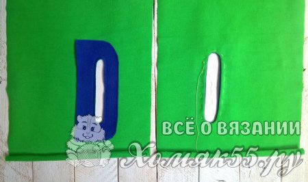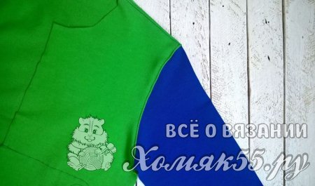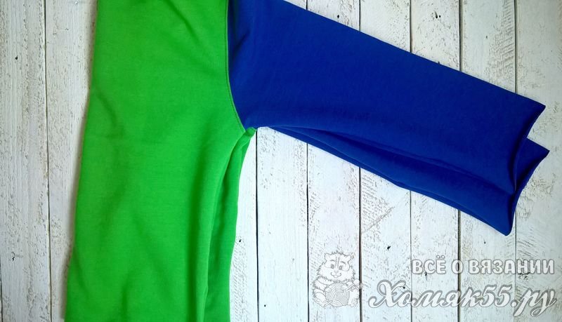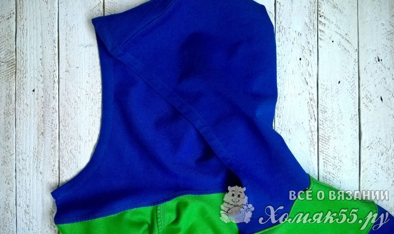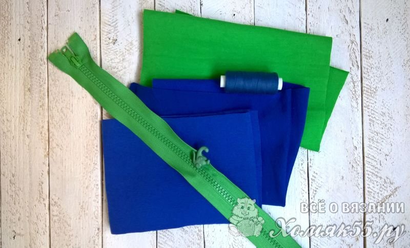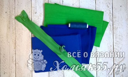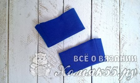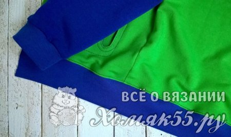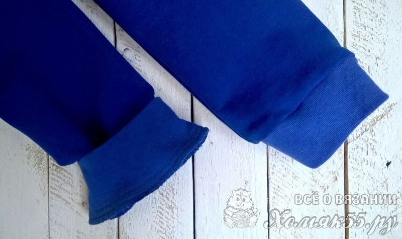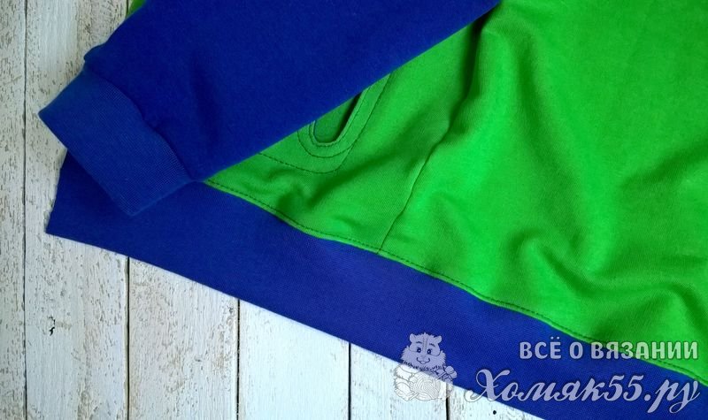 2. Из синего футера мы выкроили две детали капюшона, два рукава, две детали обтачки карманов. Из синей рибаны – две детали манжет и один длинный прямоугольник – для нижней планки.