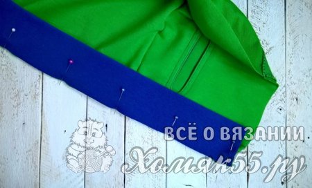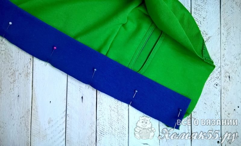 16. Сверните вдвое деталь нижней планки кофты изнанкой внутрь и приложите ее к низу кофты точно так же, как прикладывали манжеты к низкам рукавов. Скрепите кофту с планкой булавками и прострочите трикотажным швом.