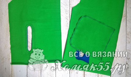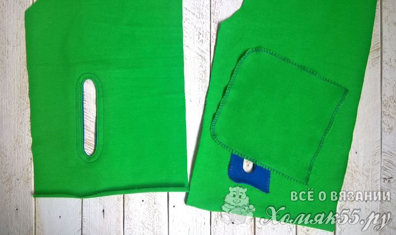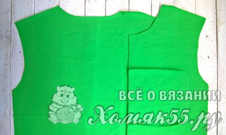 1. Для начала, выкроите все нужные детали будущей кофты. Из зеленого футера у нас получились две детали полочек, одна спинка и две мешковины карманов.