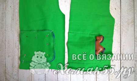 5. Теперь нужно перейти к оформлению полочек и добавить к ним карманы. Выберите, на каком уровне вы хотели бы разместить карманы. Приложите деталь обтачки кармана к полочке (лицом к лицу), зафиксируйте булавками, а потом и наметочным швом. На выкройке этой модели указаны места прорезей карманов – перенесите эти обозначения на деталь обтачки, чтобы знать, где прострочить овал входа в карман.