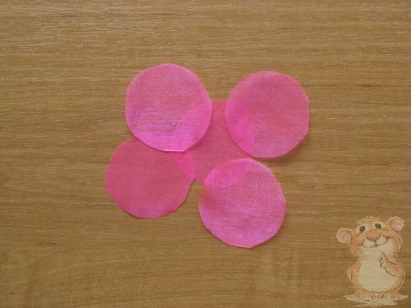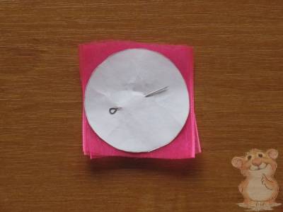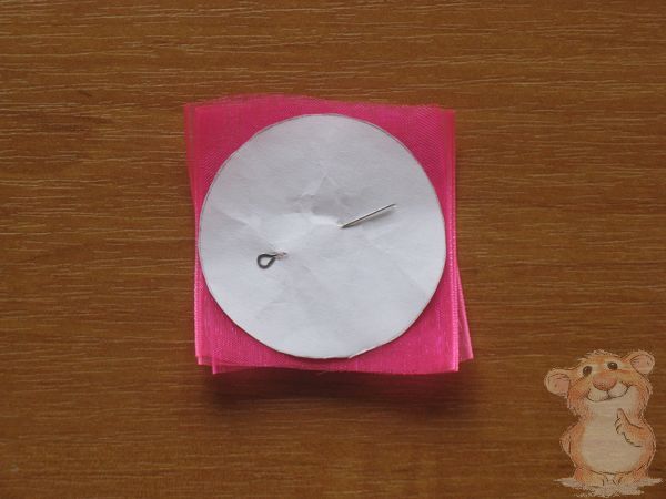 Декорировать пинетки будем с помощью небольших цветочков, для этого из ленты органзы шириной 5 см нарезаем 10 квадратов размером 5×5. Заготовим шаблон круга диаметром 5 см. Складываем в стопку нарезанные квадраты, накладываем сверху шаблон круга, прикалываем булавкой и вырезаем детали.