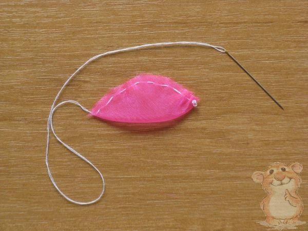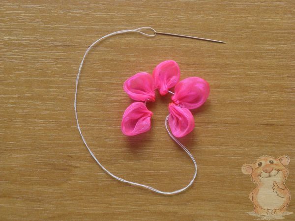 Собираем лепестки на нитку, закрепляем с изнаночной стороны несколькими стежками.