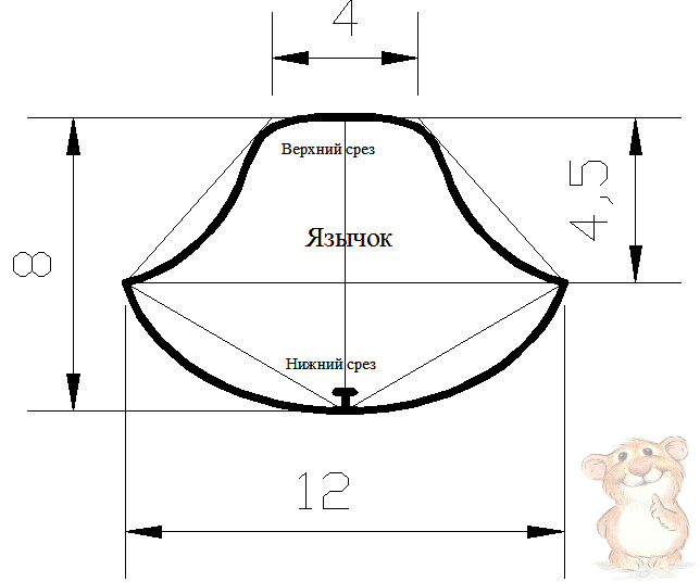 Пришиваем язычок к подошве, для этого совмещаем центр нижнего среза язычка и центр носочка подошвы, ширина строчки 0,3-0,5 см.
