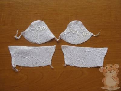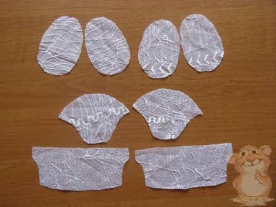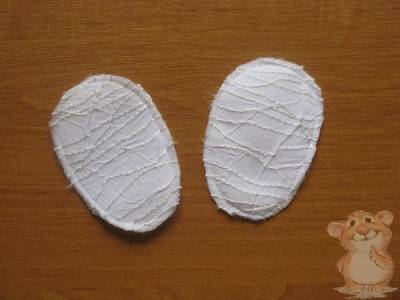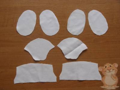 Такие же детали выкраиваем из дублирующей ткани. В качестве дублирующего материала можно использовать любой вид клеевой прокладки или можно ее заменить обычной белой бязью. При использовании бязи детали соединяются машинной строчкой.
