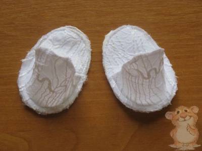Пришиваем задник пинеток к подошве, для этого соединяем середину нижнего среза задника с серединой пяточки подошвы, ширина строчки 0,3-0,5 см. Образовавшийся на лицевой стороне припуск шва оверлочиваем и завязываем ленты в виде бантика.