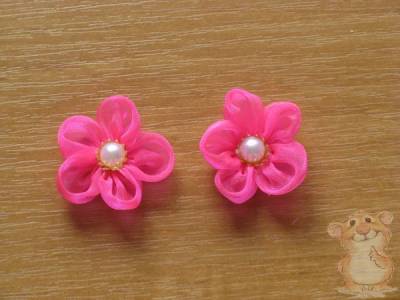 Приклеиваем заготовленные цветки к пинеткам, на края атласной ленты приклеиваем маленькие бусинки.