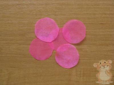 Заготавливаем лепестки цветка. Круг складываем пополам, по свободному срезу прокладываем строчку, затягиваем строчку и закрепляем несколькими стежками. Таким способом для одного цветка заготавливаем пять лепестков.