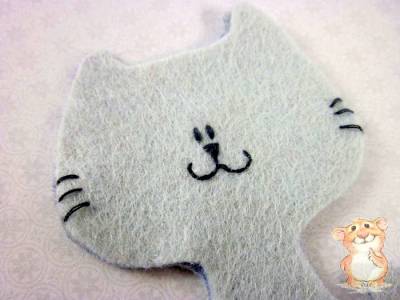 На одной из детали вышиваем все части мордочки кошечки с помощью черных ниток. Выбирать лучше стоит тонкие нитки и тонкую иголку, чтобы не оставить на фетре больших дырок от проколов.