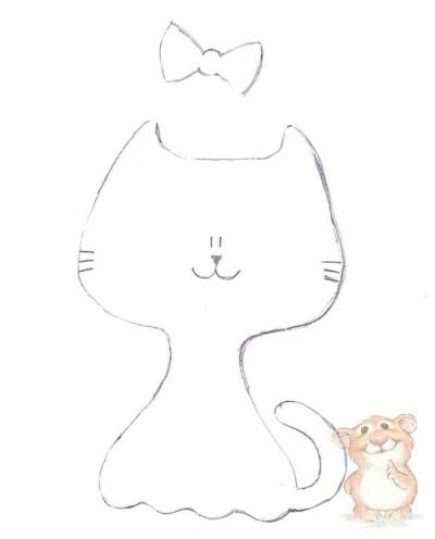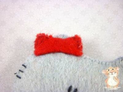 Прикладываем 2 части бантика к одному из ушек кошечки. Пришиваем его к основной детали. В серединку бантика можно пришить парочку бусинок.