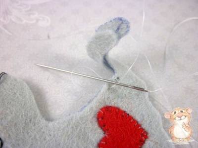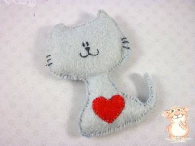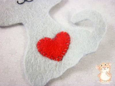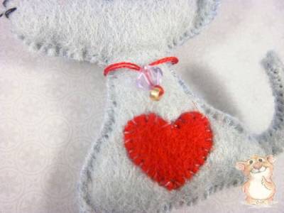 На брюшке у кошечки пришиваем сердечко с помощью прозрачных ниток типа леска.