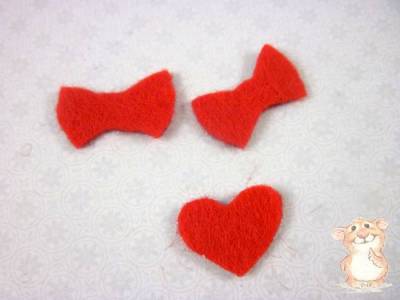 Из красного фетра выкраиваем 2 бантика и 1 сердечко.