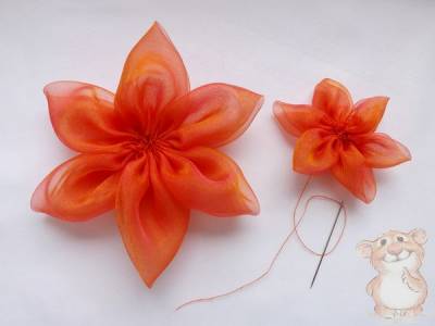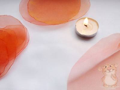 3. Теперь я подробно опишу процесс изготовления главного составляющего моего ободка для волос – пышного яркого цветочка. Из подготовленной органзы вырезаю шесть кружков диаметром 12 см., и шесть кружков – 8 см.