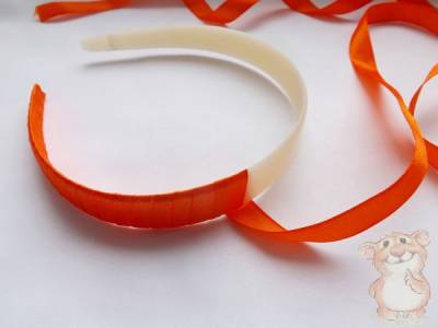 1.Первым делом оборачиваю обычный пластиковый ободок для волос узкой атласной лентой. Необходимая длинна ленты будет зависеть от ширины ободка. Обкручиваю туго, насколько это возможно, по внутренней стороне фиксирую ряды горячим клеем.