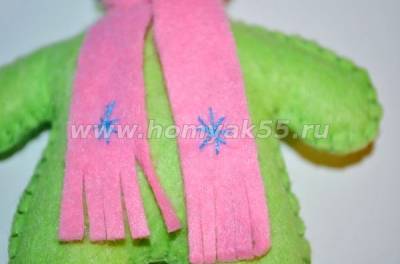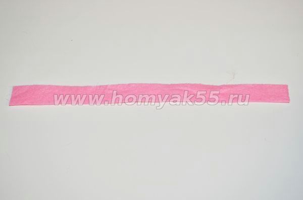Шаг 7. После того как сама игрушка будет сшита, переходим к её оформлению декоративными элементами. Изготовим шарфик, для этого возьмем фетр розового оттенка и вырежем из него полоску, шириной около 1-го см и длинной 15-18 см. С двух сторон по краям полоску выполним надрезы в виде небольшой бахромы.