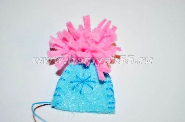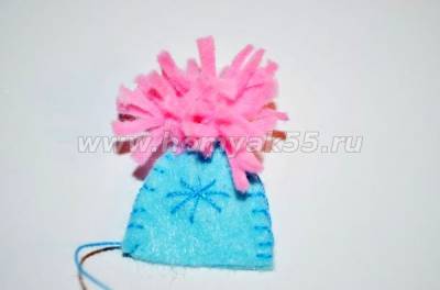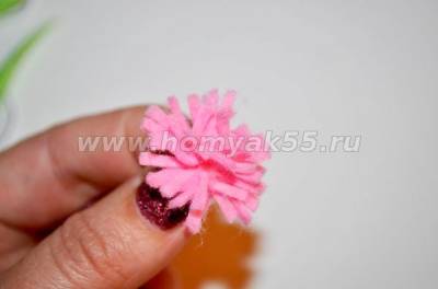 Шаг 12. Из розового фетра сформируем помпон. Сделать это совсем несложно, необходимо отрезок ткани, шириной 2 см и длинной 8-10 см надрезать с одной стороны как бахрому, а затем скрутить его в трубочку. Помпон - готов!