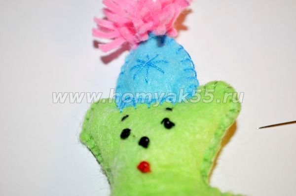 Шаг 14. Надеваем получившуюся шапочку на голову мишке и пришиваем её уже знакомым нам обметочным швом.