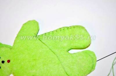 Шаг 5. Теперь соединяем обе половинки игрушки лицевой стороной вверх и сшиваем её по контуру, зелеными нитями, используя обметочный шов. Стежки стараемся делать небольшие и аккуратные.