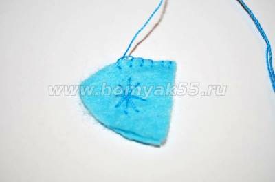 Шаг 10. На одной из деталей, с лицевой стороны вышьем нитями голубого оттенка на шапочке снежинку.