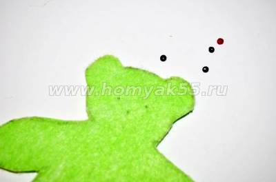 Шаг 3. Сразу же на лицевую часть мордочки игрушки пришиваем две маленькие черные бисерины как глазки, одну как носик и красную бусину как ротик.