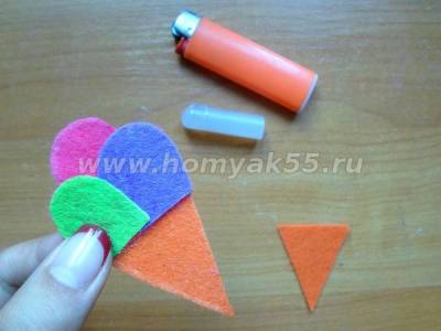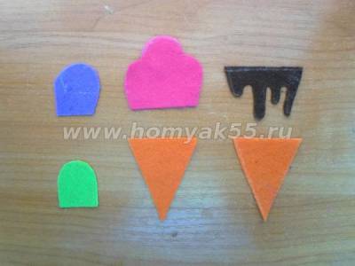 Для начала разберемся с фетром. Из коричневого и оранжевого цветов у нас будет состоять рожок, а цветной фетр для разноцветного мороженого. С помощью мыла рисуем следующие детали: