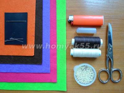 - Фетр разных цветов: - оранжевый; - коричневый; - зеленый; - фиолетовый; - розовый;