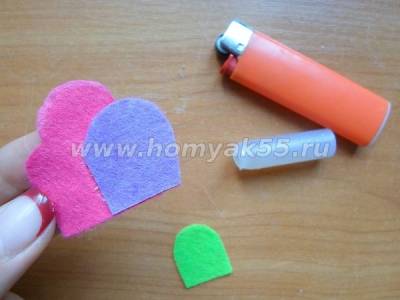Малиновый слой у нас служит основой, на которую мы накладываем зеленый и фиолетовый фетр. Собираем детали верха мороженого с помощью силиконового клея.