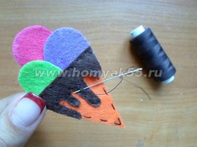 Наше мороженое так же украшено шоколадом, который мы пришиваем к верхнему срезу рожка. Техника ручных стежков такая же, главное выполнять их немного мельче (для удобства огибания округлых срезов капель).