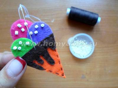 Верх мороженого украшаем белым бисером. Аккуратно пришиваем его белыми нитками в хаотичном виде.