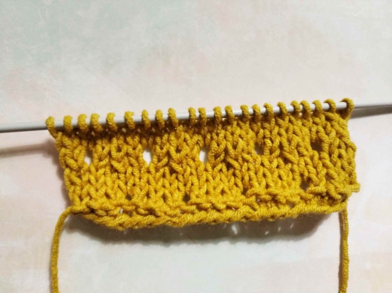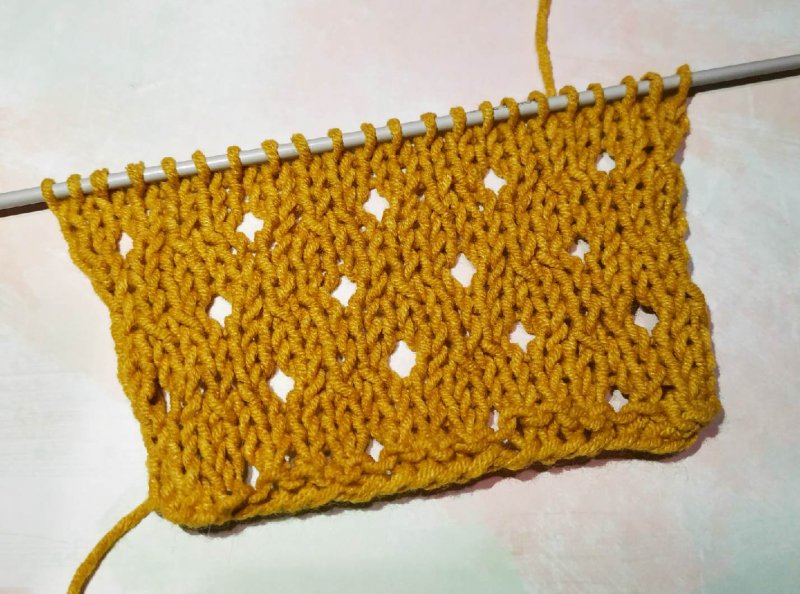 1 ряд: кромочная петелька, затем выполним накид, 1 лицевая, 2 петли провяжем вместе лицевой, 1 лицевая. Повторяем все снова.