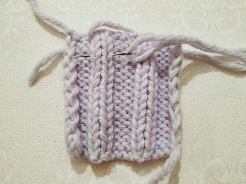 А теперь берем хвостик нитки, которой делали швы. И подтягиваем, как бы стягивая вязание. И так образуется самая простая и быстрая косичка на 2 лицевых петельках.